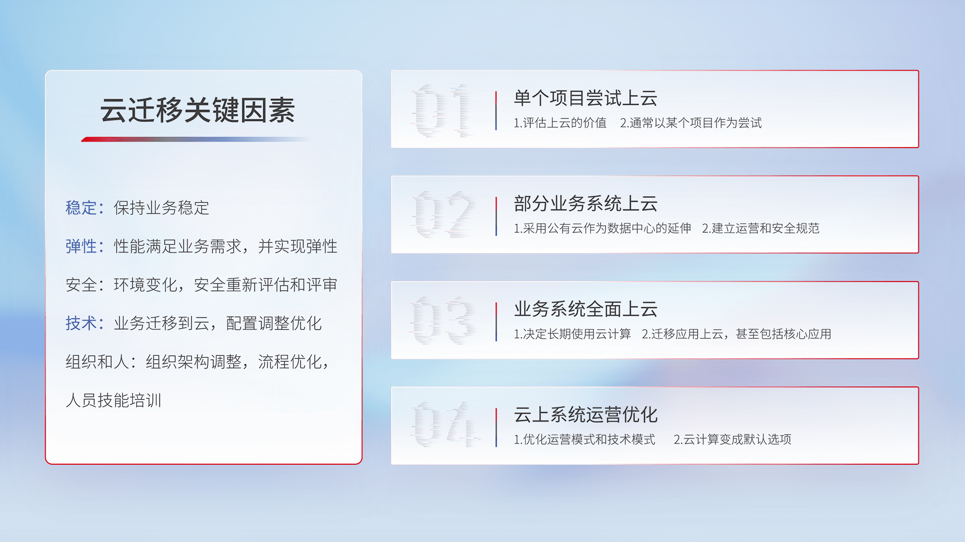 结合实际业务,,,从规划设计、、、、云平台选型、、、、云原生改造、、、、数据迁移、、、、集成交付,,,,迁移全过程为客户识别最佳上云路径,,,,做好风险识别管理,,,设计网络架构、、、身份权限、、、、安全审计合规、、操作审计、、日志审计、、、、监控告警策略、、多站点容灾设计等,,对云上基础设施进行整体规划,,提升IT治理水平,,,,以满足弹性、、、高可用、、、、高性能的需求。。