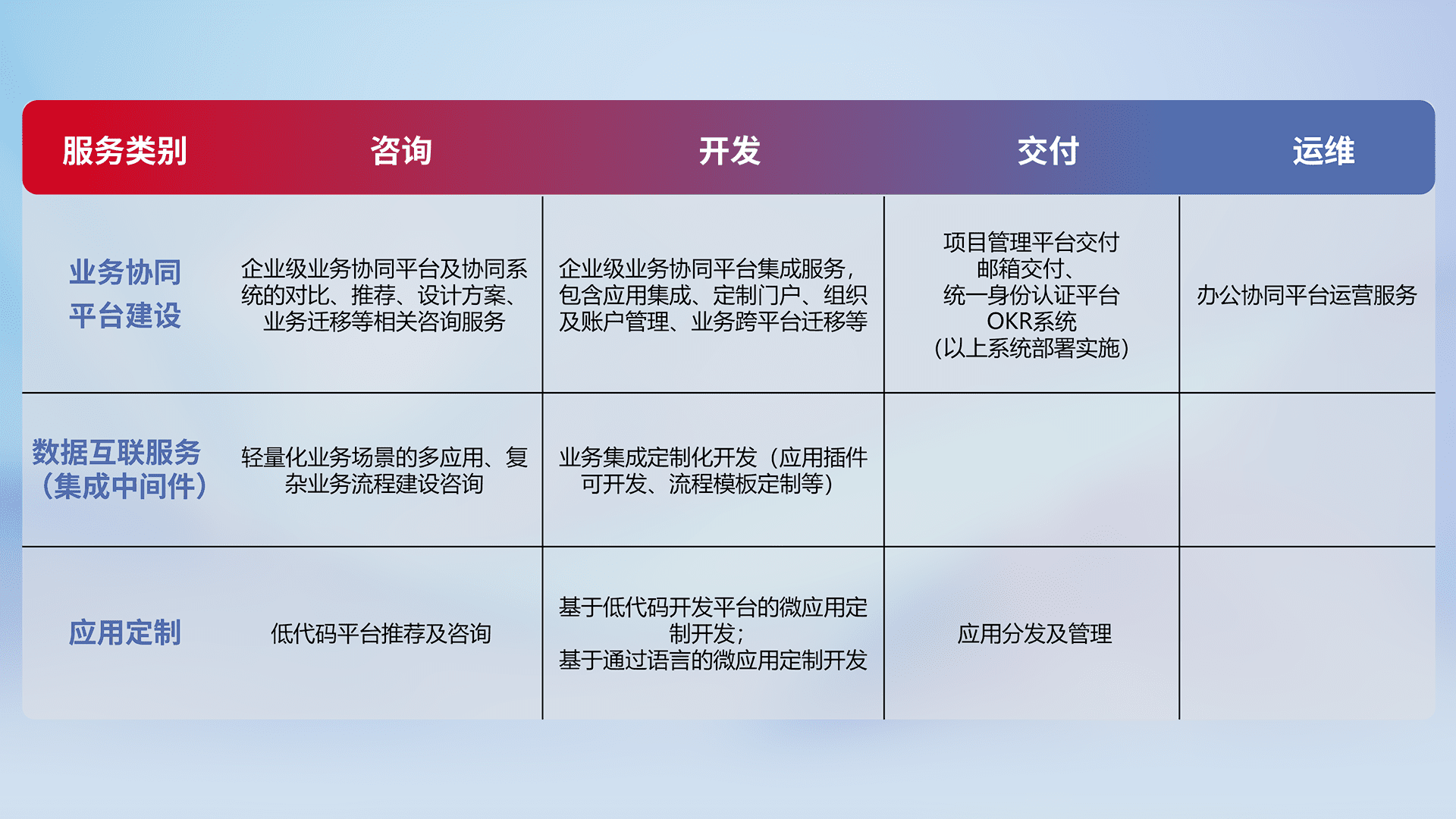 针对钉钉、、、、企微、、、IDaas等平台级产品提供产品的规划、、、方案、、、、交付、、定制化开发等服务,,,,实现如统一协同办公、、、智能客户服务、、混合会议管理、、、智能数据查询、、等业务场景,,实现数字化转型。。